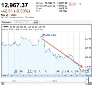 Since the first Tuesday in November it seems that Wall Street has been signifying its displeasure with BHO. With the advent of the so-called fiscal cliff it seems that Wall Street has just gotten worse. No one can really know how the financial markets would have reacted if Romney had won.