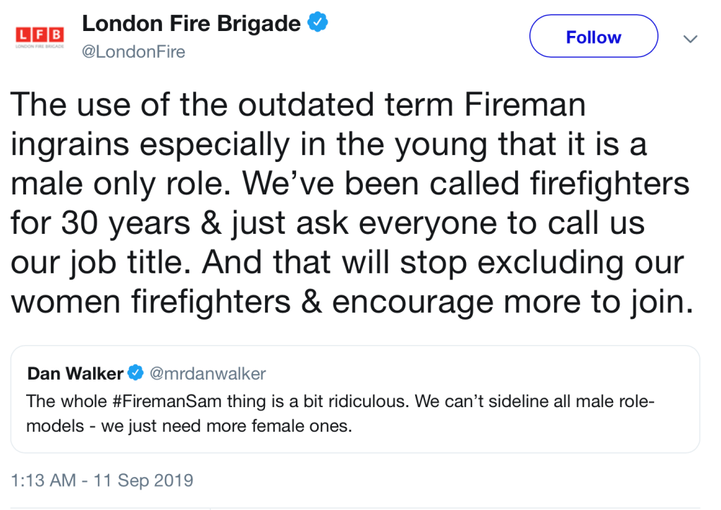 We’re not bothered about Fireman Sam. We’re bothered by the subconscious message the term fireman has created as an issue in our recruitment.